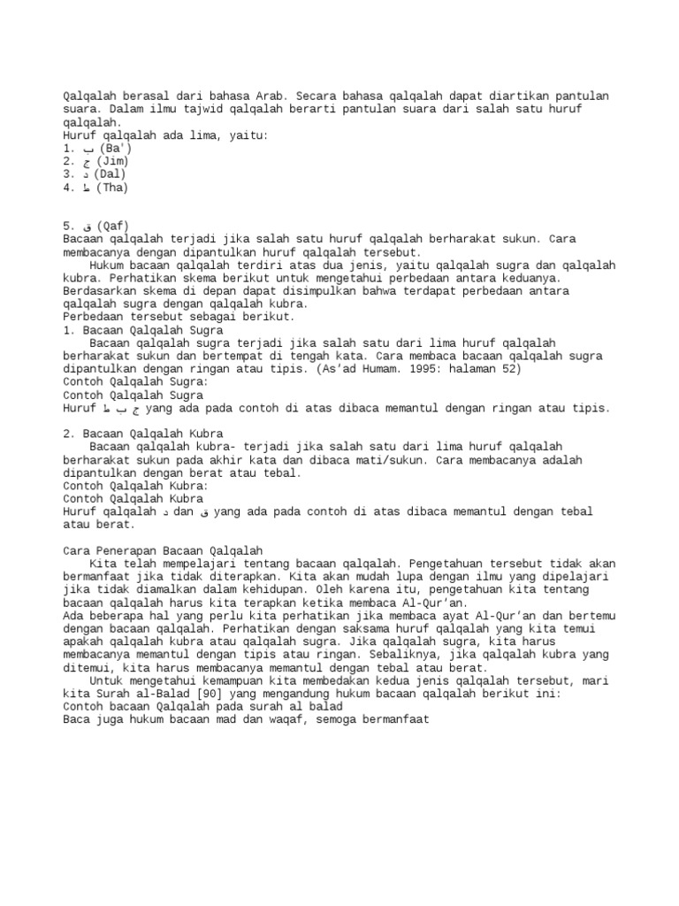 Hukum bacaan qalqalah sugra terjadi apabila huruf qalqalah itu mati sukun pada kata asalnya. Pengertian qalqalah sugra dan kubra penting untuk anda ketahui bagi anda yang sedang belajar mengaji. Sebutkan 10 contoh qalqalah sugra dan 10 contoh qalqalah kubra beri tanda letak qalqalahnya 10610252. Huruf itu mati karena dihentikan atau diwaqafkan dan berada pada akhir kata. Qalqalah adalah salah satu hukum bacaan yang terbagi menjadi 2 yaitu qalqalah sugra dan kubra. 30 contoh qalqalah sugra dan kubra dalam al quran beserta surat dan ayatnya sabtu 03 november 2018 al quran contoh qolqolah kubro qolqolah sugro qolqolah adalah cara membaca huruf hijaiyah dalam al quran dengan tatacara memantulkan huruf tersebut.