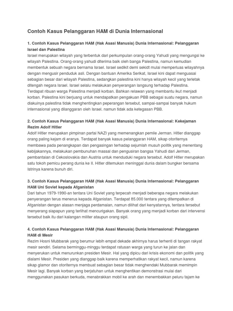 Kasus pelanggaran ham di dunia internasional. Pengertian pelanggaran ham kasus pelanggaran ham merupakan salah satu kasus yang sudah banyak terjadi pada lingkungan masyarakat secara umum. Karena pentingnya mengerti ham sebab banyak orang yang secara tidak langsung melanggarnya. Pelanggaran pelanggaran yang dilakukan tentunya diselesaikan sesuai dengan kebijakan yang berlaku secara universal di dalam dunia internasional dan disesuaikakan dengan bentuk bentuk negara dan sistem politik di berbagai. Pengertian ham macam macam ham contoh pelanggaran ham dan pelanggaran ham di indonesia sejak lahir setiap manusia sudah mempunyai hak asasi yang dijunjung tinggi serta diakui semua orang. Kasus pelanggaran ham pembunuhan munir 5.