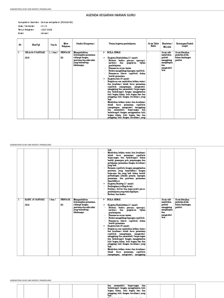 Buku agenda guru merupakan salah satu komponen administrasi yang harus dimiliki guru ketika melakukan pembelajaran. Data semester dan tahun pelajaran 1. Standar kompetensi atau kompetensi inti menyesuaikan dengan kurikulum yang digunakan 6. Contoh jurnal harian mengajar agenda guru mungkin bisa digunakan kurikulum 2013 k13 sebagai catatan kegiatan harian guru mata pelajaran atau guru kelas yang wajib dilakukan seorang guru pada proses sebelum dan sesudah kegiatan pembelajaran. Buku agenda guru adalah buku kerja yang berisi catatan aktivitas guru selama pembelajaran baik yang dilakukan di dalam maupun di luar kelas. Dengan adanya jurnal mengajar guru mata pelajaran akan menganalisis jenis hambatan dan akan cepat mudah dalam pemecahan masalah dalam kegiatan belajar mengajar kbm di kelas.