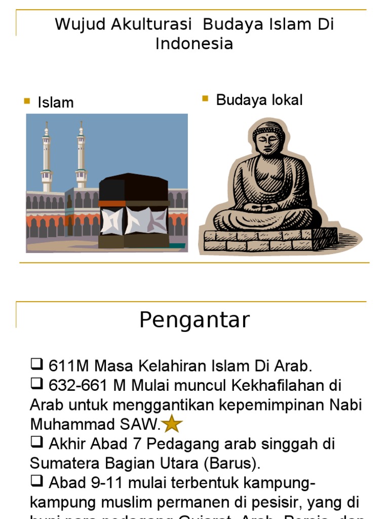 Bentuk bentuk bangunan candi di indonesia pada umumnya merupakan bentuk akulturasi antara unsur unsur budaya hindu buddha dengan unsur budaya indonesia asli. Ini sebagai wujud akulturasi antara budaya asli indonesia dengan budaya hindu budha. Akulturasi kebudayaan islam adalah sebuah perpaduan budaya yang kemudian menghasilkan budaya baru tanpa menghilangkan unsur unsur asli dalam budaya contohnya sebuah proses percampuran 2 budaya atau lebih yang saling bertemu dan berlangsung dalam waktu yang lama sehingga dapat saling memengaruhi. Agama dalam kehidupan manusia. Candi sendiri adalah bentuk perwujudan akulturasi yang terjadi diantara indonesia dengan india. Contoh akulturasi definisi akulturasi adalah ketika dua kebudayaan saling bertemu dan saling mempengaruhi tanpa menghilangkan budaya asliterdapat banyak contoh akulturasi budaya yang terjadi di indonesia karena pengaruh budaya arab china melayu india persia dan lain lain.