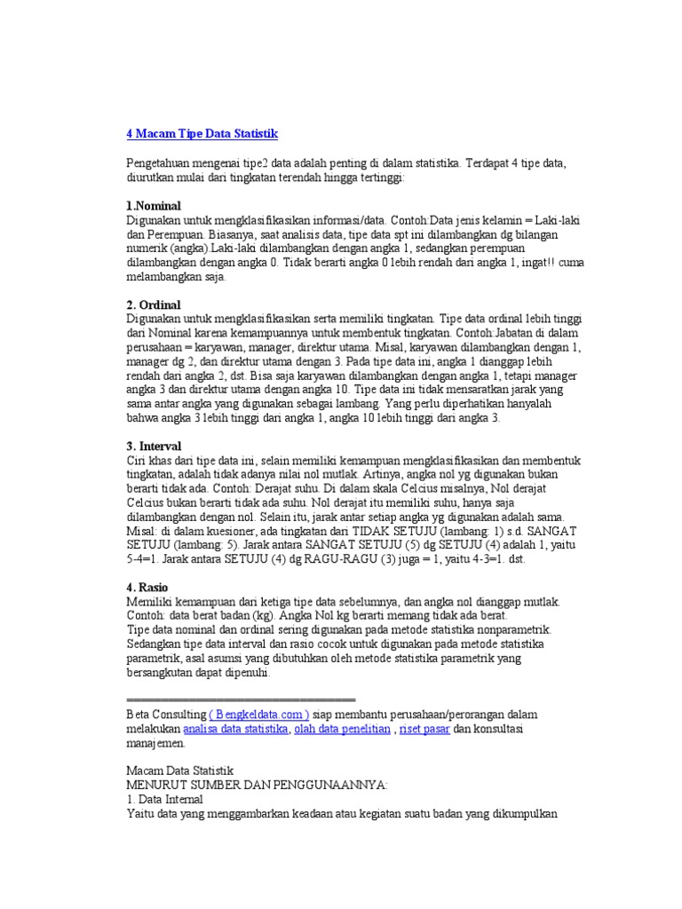 Contoh analisis data statistik. Contoh analisi deskriptif pada sebuah kegiatan penelitian tindakan kelas ini dapat dijadikan rujukan bagaimana melakukan analisis deskriptif. Statistik deskriptif hanya terbatas pada menyajikan data bentuk tabel diagram grafik dan besaran lain. Bila anda menggunakan data bersifat ranking atau ordinal maka spearman adalah analisis yang baik. Contoh analisis data analisis data merupakan salah satu jenis pekerjaan yang membutuhkan keahlian khusus. Seorang yang belajar statistika biasanya bekerja dengan data numerik yang berupa hasil cacahan ataupun hasil pengukuran atau bahkan mungkin dengan data kategorik yang diklasifikasikan menurut. Statistikastatistik yaitu merupakan suatu ilmu yang mempelajari tentang cara cara pengumpulan data penyajian data dan juga analisis dan interpretasi tentang data tersebut.
