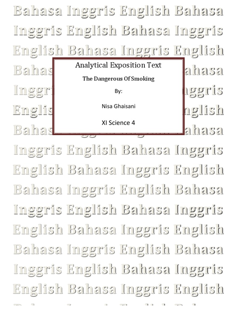Smoking atau yang dalam bahasa indonesia nya kita sebut dengan merokok adalah isu yang menarik untuk dibahas dalam sebuah contoh analytical exposition textalasannya adalah karena merokok merupakan hal yang tidak menyehatkan bahkan bisa dibilang beracun namun dengan alasan tertentu dilegalkan oleh pemerintah. Tapi meski rokok dilegalkan pemerintah serta pihak produsen rokok secara tegas. Or inhaled a cloud of smoke as a group of smokers passed causing you to cough and choke. Contoh analytical exposition text bisa dibaca dalam blog ini karena telah dikumpulkan 7 contoh teks pendek berjenis argumentative ini. Barangkali ada beberapa jawaban masih kurang tepat bisa memberitahukan untuk diperbaiki. Bagi yang masih kurang paham apa dan bagimana itu teks analitis ini bisa membaca what is analytical exposition.