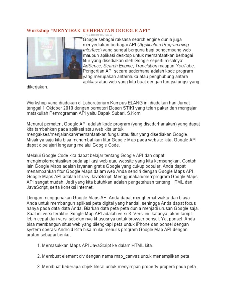 Api adalah singkatan dari application programming interface dan memungkinkan developer untuk mengintegrasikan dua bagian dari aplikasi atau dengan aplikasi yang berbeda secara bersamaan. Api application programming interface adalah sekumpulan perintah fungsi dan protocol yang dapat digunakan oleh programmer saat membangun perangkat lunak untuk system operasi tertentu. Api application programming interface adalah sekumpulan perintah fungsi komponen dan protokol yang disediakan oleh sistem operasi ataupun bahasa pemrograman tertentu yang dapat digunakan oleh programmer saat membangun perangkat lunak. Api memungkinkan programmer untuk menggunakan fungsi standar untuk berinteraksi dengan system operasi. Api memungkinkan programmer untuk menggunakan fungsi standar untuk berinteraksi dengan system operasi.