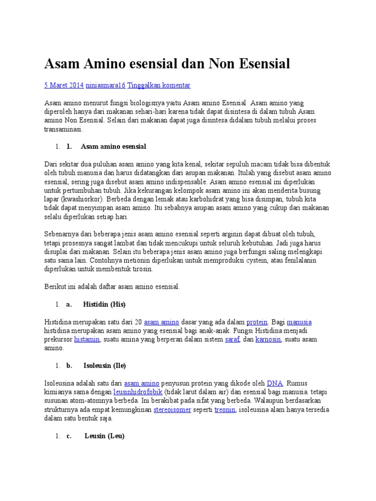 Alanin asparagin asam aspartat asam glutamat glutamin dan prolin. Manusia dapat menghasilkan 10 dari 20 asam amino. Berbeda dengan lemak atau karbohidrat yang bisa disimpan tubuh kita tidak dapat menyimpan asam amino. Itulah yang disebut asam amino esensial sering juga disebut asam amino indispensable. Arginin adalah asam amino esensial yang diperlukan tubuh untuk pembuatan cairan seminal air mani dan memperkuat sistem imun. Asam amino non esensial adalah asam amino yang bisa diproduksi sendiri oleh tubuh sehingga memiliki prioritas konsumsi yang lebih rendah dibandingkan dengan asam amino esensial.