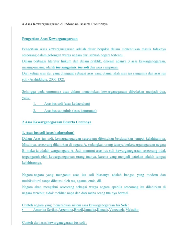 Contoh asas ius sanguinis. Ius sanguinis atau jus sanguinis bahasa latin untuk asas keturunan hak untuk darah atau pertalian darah adalah hak kewarganegaraan yang diperoleh seseorang individu berdasarkan kewarganegaraan ayah atau ibu biologisnya. Tujuan penerapan asas ius sanguinis adalah untuk melestarikan dan mempertahankan keturunan bangsanya di negara negara lain. Negara yang menganut asas ini akan mengakui kewarganegaraan seorang anak sebagai warga negaranya apabila orang tua dari anak tersebut adalah memiliki status kewarganegaraan negara tersebut dilihat dari keturunannya. Perbedaan asas ius sanguinis dan ius soli. Dari ketiga asas itu yang dianggap sebagai asas yang utama ialah asas ius sanguinis dan asas ius soli asshiddiqie 2006132. Dalam berbagai literatur hukum dan dalam praktik dikenal adanya 3 asas kewarganegaraan masing masing adalah ius sanguinis ius soli dan asas campuran.