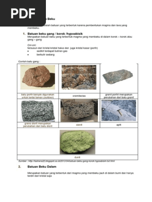 Berdasarkan tempat terbentuknya batuan beku dibedakan menjadi 2 jenis yaitu batuan beku dalam dan batuan beku luar. Contoh batuan beku dalam. Contoh batuan beku dalam intrusif berdasarkan ciri cirinya ada lima contoh batuan beku dalam yang bisa kita temukan. Ciri ciri tersebut dapat kita temukan misalnya pada beberapa contoh batuan. Itu berarti letak pembekuan batuan beku korok ini lebih dekat dengan permukaan bumi. Batuan beku dalam atau batuan plutonik terbentuk karena pembekuan yang terjadi di dalam dapur magma secara perlahan lahan sekali sehingga tubuh batuan terdiri dari kristal kristal besar.
