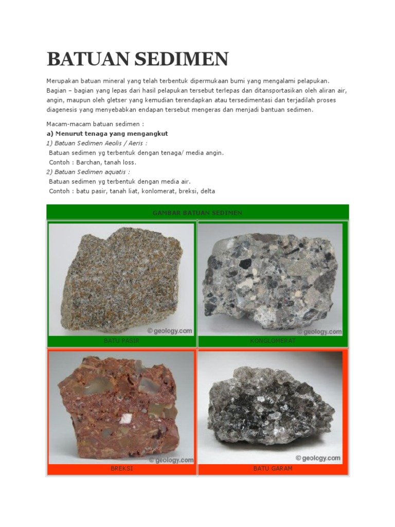 Beberapa contoh sifat kimia tertentu yang dimiliki oleh beberapa komponen yang dimaksud adalah udara atau air dimana 2 komponen kimia tersebut akan membuat permukaan batuan menjadi sebuah partikel partikel yang. Batuan sedimen yang terbentuk dari proses pelapukan kimiawi yang kemudian mengalami pemisahan molekul zat. Dan pengendapan precipitation dari larutanjenis batuan umum seperti batu kapur batu pasir dan lempung termasuk dalam batuan. Pada dasarnya nama batuan sedimen diambil dari besarnya. Contoh batuan sedimen kimiawi lainnya adalah batuan anhidrit dan batu garam. Batuan sedimen non klastik terdiri atas batuan sedimen kimiawi dan batuan sedimen organis.