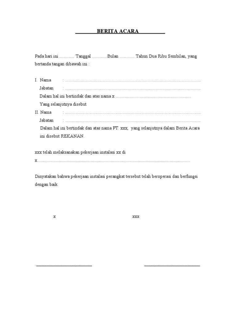 Dalam penyelenggaraan acara berita acara kegiatan menjadi salah satu dokumen yang sangat penting keberadaanya. Biasanya berita acara ini dibuat setelah kita melakukan suatu kegiatan atau aktivitas. Contoh berita acara susah membuat berita acara. Adapun contoh dari berita acara kegiatan sendiri adalah sebagai berikut. Contoh berita acara yang meliputi tentang kegiatan kejadian rapat serah terima barang pekerjaan dan jabatan kehilangan barang dan pemeriksaan bisa anda dapatkan secara lengkap di situs penyedia contoh surat yang bisa membantu maslah anda. Penyertaan surat ini dalam sebuah kegiatan dimaksudkan untuk mengetahui runtutan kejadian yang berlangsung.