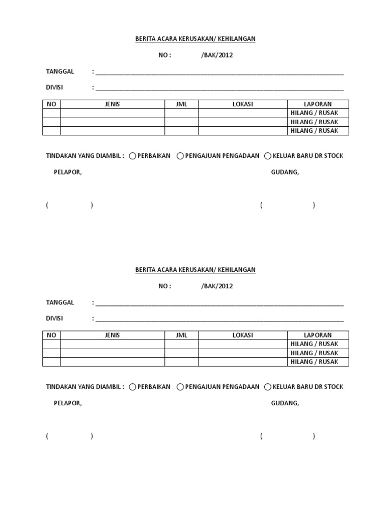 Selain itu gambar ini juga memiliki berbagai ukuran. Baik peristiwa seminar kepemilikan hingga jual beli suatu barang. Berita acara kerusakan barang merupakan sebuah berita acara yang didalamnya berisi sebuah kerusakan barang di suatu tempat tertentu. Penyertaan surat ini dalam sebuah kegiatan dimaksudkan untuk mengetahui runtutan kejadian yang berlangsung. Berita acara kerusakan barang sering kali kita buat dan mungkin kita tidak tahu bagaimana cara untuk membuatnya. Oleh karena itu banyak diantara kita yang masih bingung bagaimana membuat surat berita acara ba terkait kerusakan barang yang ada di perusahaan atau di tempat kita bekerja lainnya sebagai pemberitahuan kepada atasan atau juga sebagai dokumen yang kita butuhkan untuk data asset.