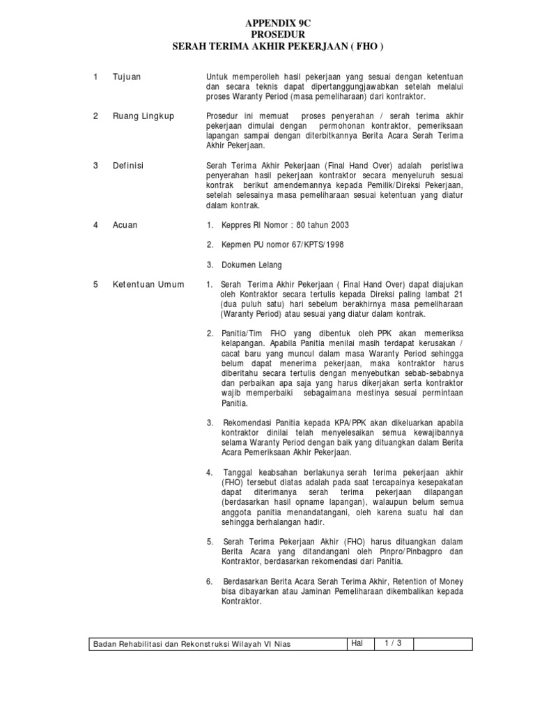 Serah terima akhir pekerjaan final hand over fho adalah suatu kegiatan serah terima akhir pekerjaan dari penyedia jasa kepada direksi pekerjaan setelah penyedia jasa menyelesaikan semua kewajibannya selama masa pemeliharan. Berita acara serah terima akhir pekerjaan proyek. Berita acara pemeriksaan akhir. Serah terima pekerjaan adalah bagian dari proses pengadaan barangjasa dimana proses tersebut dilaksanakan setelah selesainya waktu pelaksanaan pekerjaan yang sebut dengan serah terima pertama pekerjaan dan selesainya waktu pemeliharaan pekerjaan disebut serah terima akhir pekerjaan agar pekerjaan yang telah dilaksanakan bersama sama oleh yang mingikat perjanjian betul betul. Bahwa berita acara ini merupakan bagian dari pelaksanaan perjanjian dan sebagai tanda terima hasil pekerjaan diantara para pihak dan karenanya merupakan satu kesatuan dan bagian yang tidak terpisahkan dari perjanjian. Adapun pada saat proses penyerahan akhir hasil pekerjaan ini kelengkapan dokumen yang harus dilengkapi adalah sebagai berikut.