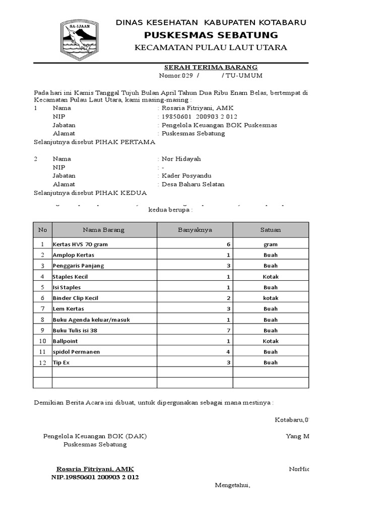 Contoh berita acara serah terima barang atk. Semua itu karena surat ini adalah bukti sah transaksi perpindahan tangan dari suatu divisi perusahaan atau lembaga. Halo sobat nehanesia apakah anda sedang mencari contoh surat berita acara serah terima barang. Demikianlah berita acara serah terima barang ini di perbuat oleh kedua belah pihak adapun barang barang tersebut dalam keadaan baik dan cukup sejak penandatanganan berita acara ini maka barang tersebut menjadi tanggung jawab pihak kedua memlihara merawat dengan baik serta dipergunakan untuk keperluan tempat dimana barang itu dibutuhkan. Alangkah baiknya apabila surat ini secepatnya diberikan bubuhan tanda tangan ketika sedang prosesi penyerahan suatu barang oleh satu pihak tertuju pihak yang lain. Ataukah anda masih bingung bagaimana membuat surat serah terima barang nah kebetulan saya ada contohnya nih mudah mudahan contoh dari saya ini dapat sobat jadikan referensi. Contoh surat serah terima barang dalam kegiatan perpindahan barang tentu saja memerlukan sebuah bukti sah yang dapat dipertanggung jawabkan ke depannya seperti surat serah terima barang.