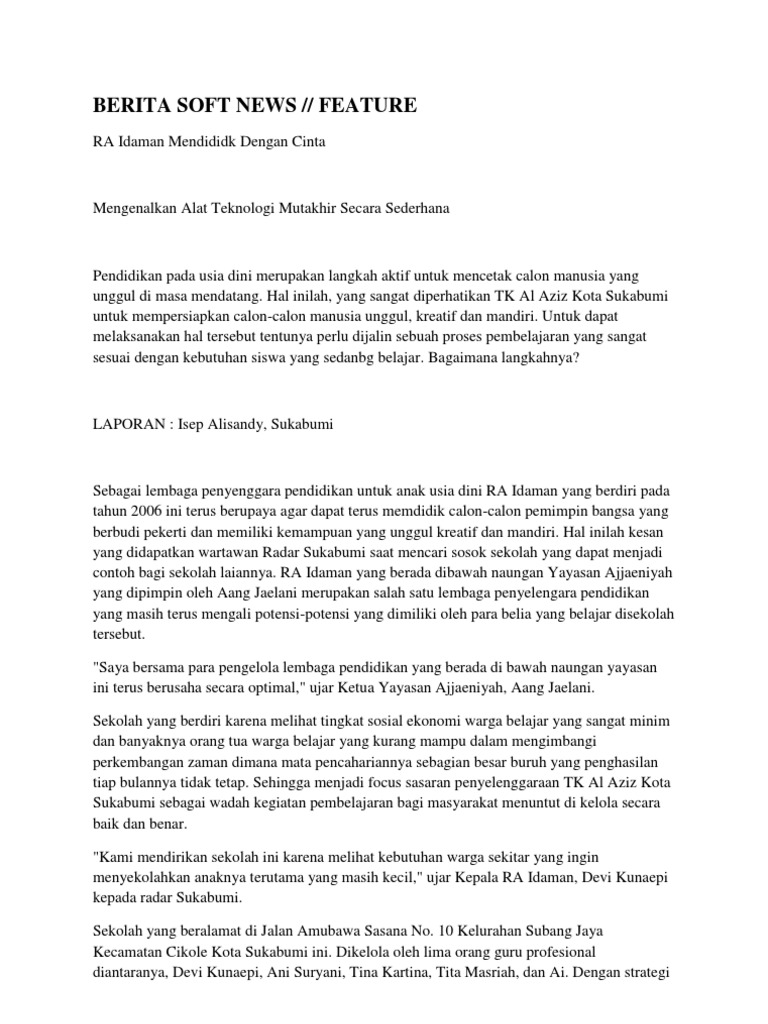 Adalah memakai sistem piramida terbalik dalam penulisan berita. Di postingan saya sebelumnya sudah dijelaskan tentang apa itu berita hard news soft news dan feature. Contoh naskah berita hard news description. Soft news nilai beritanya di bawah hard news dan lebih merupakan berita pendukung. Media online terkini info nasional internasional ekonomi sosial dan news analisis untuk anda. Pedagang pasar blok g mengeluhkan sepinya pengunjung kameramen.