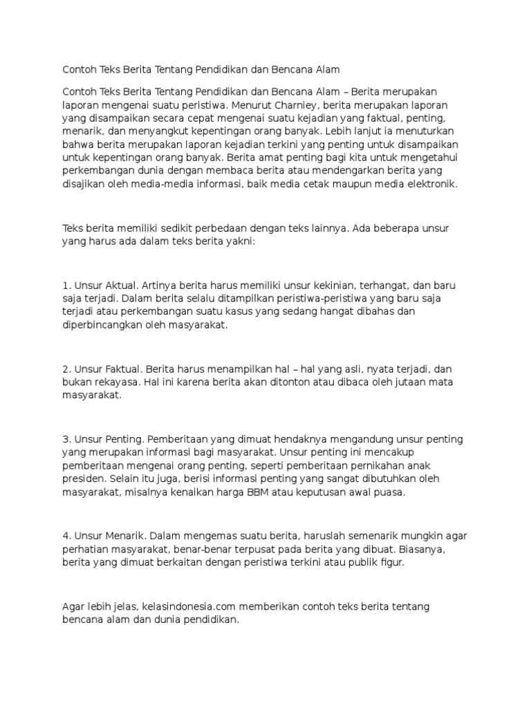 Contoh berita tentang pendidikan. Ini dikarenakan teks berita haruslah memuat fakta yang dapat memberi informasi melalui struktur penyampaian 5w1h. Proses belajar mengajar siswa smasmk di jawa timur mulai 2 juni 2020. Di bawah ini akan dijelaskan tentang contoh contoh teks berita. Topik tentang berita yang disampaikanpun sangat luas berhubung kebanyakan dari kia masih anak. Bisa juga disiarkan lewat radio atau televisi. Nah di materi bahasa indonesia terdapat teks berita yang merupakan hasil peristiwa yang nyata terjadi.