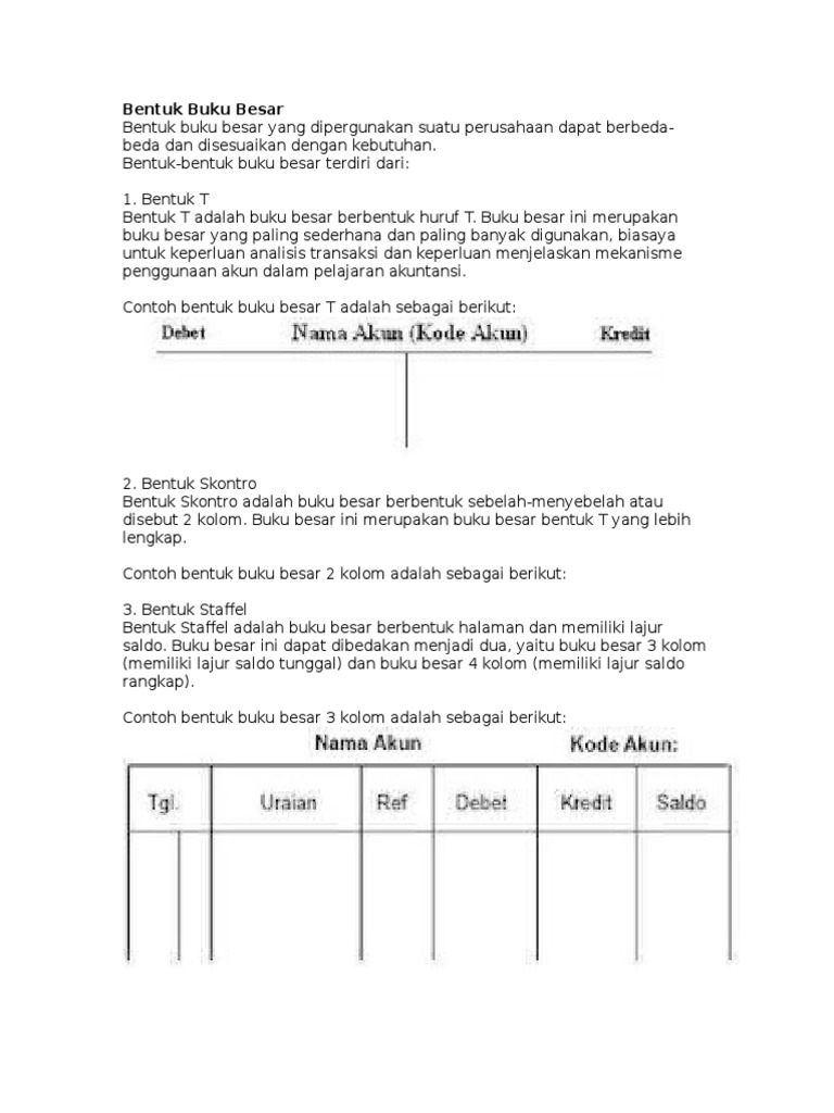 Buku besar bentuk t dalam akuntansi atau keuangan yaitu bentuk buku besar yang sangat sederhana dan bentuknya hanya seperti huruf t besar. Bentuk buku besar ini adalah yang paling sederhana dna hanya berbentuk seperti huruf t besarsebelah kiri menunjukan sisi debet dan sebelah kanan menunjukan sisi kredit. Nama akun diletakan di kiri atas dan kode akun diletakan di kanan atas. Berdasarkan bentuknya buku besar dibagi menjadi 4 jenis yaitu buku besar berbentuk t sederhana bentuk skontro bentuk staffle dan bentuk staffle berkolom rangkap ganda. Contoh buku besar bentuk t. Inilah pengertian fungsi bentuk dan contoh buku besar akuntansi buku besar akuntansi adalah wadah alat buku tempat pemindahan akun yang berasal dari jurnal bentuk buku besar diantaranya adalah bentuk t dan bentuk staffelskontro.