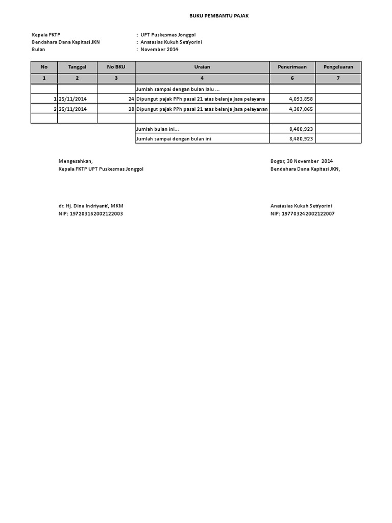 Contoh format buku kas desa pembantu pajak ini berbasis ms. Ppn pajak pertambahan nilai adalah pajak yang dikenakan atas setiap pertambahan nilai dari barang atau jasa dalam peredarannya dari produsen ke konsumen. Kali ini share tentang format buku kas umum buku pembantu pajak buku pembantu kas buku pembantu bank dan tutorial cara cetak pada alpeka ts 11b bosmudah mudahan bermanfaat. Jenis jenis pajak untuk pengeluaran dana lpj bop paud terdiri dari. Buku kas umum bku buku bank desa dan buku kas pembantu pajak merupakan beberapa pembukuan atau penatausahaan keuangan desa yang dilaksanakan oleh bendahara desa atau kepala urusan kaur keuangan. Sekarang saya akan terangkan mengenai ppn pph 21 pph 22 dan pph 23.