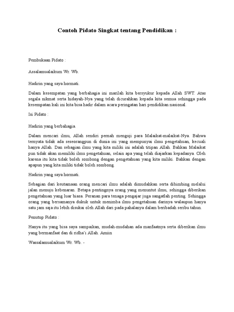 Contoh ceramah singkat tentang pendidikan. Contoh ceramah singkat. Mencari bahasan ceramah pendidikan yang membahas tentang moral maka berikut ini kami berikan untuk anda contoh ceramah tentang pendidikan moral yang membahas tentang tema moral. Contoh teks ceramah ceramah merupakan kegiatan penyampaian pesan yang mempunyai tujuan untuk memberikan nasehat petunjuk maupun petuah kepada pendengar secara lisan. Mulai dari contoh ceramah tentang fitnah ceramah tentang ghibah ceramah tentang generasi muda contoh ceramah tentang hijrah contoh ceramah larangan pacaran contoh ceramah tentang rezeki contoh ceramah tentang riba ceramah bulan suci ramadhan dll. Marilah kita panjatkan segala puji bagi allah yang telah memberikan kesempatan kepada kita semua untuk dapat berkumpul di tempat yang insya allah mulia ini dalam keadaan sehat. Manfaat langsung yang dapat dirasakan dari sebuah pendidikan adalah bertambahnya ilmu pengetahuan.