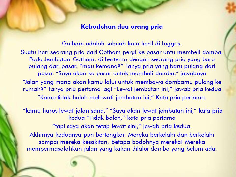 Biasanya murid akan diminta untuk mengerjakan tugas seperti itu. Namun ada baiknnya jika kita sedari dini memperkenalkan cerita rakyat kepada adik adik kita. Oleh karena itu menasihati anak salah satunya dapat dilakukan melalui cerita atau dongeng. Cerita rakyat cerita rakyat adalah salah satu cerita yang umumnya lahir dan berkembang dilingkungan masyarakat tersebut. Secara umum cerita ini berisikan tentang suatu kejadian yang terjadi di suatu daerah atau asal muasal dari suatu tempat. Entah itu bekerja belajar atau berkarya berikan selalu usaha yang terbaik agar kamu tidak menyesal.