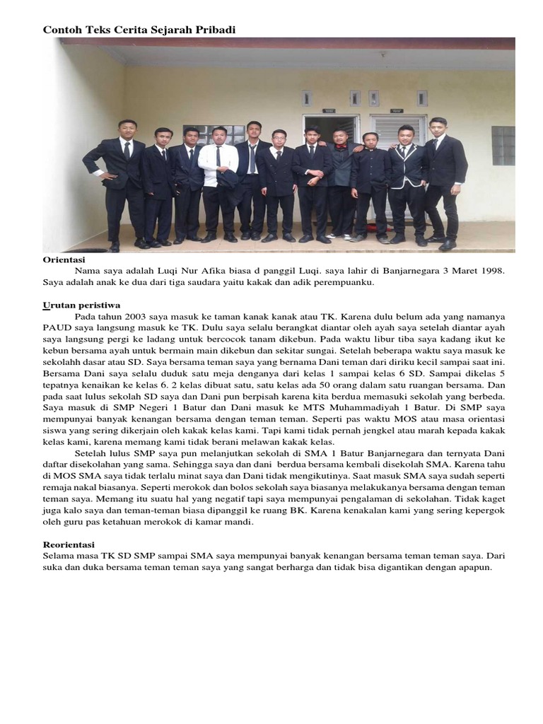 Reorientasi berisi komentar pribadi penulis tentang peristiwa atau kejadian sejarah yang diceritakan. Teks cerita sejarah diri sendiri berdasarkan kaidah dan strukturnya. Teks cerita sejarah teks cerita sejarah merupakan teks yang menjelaskan atau menceritakan mengenai fakta dan kejadian yang terjadi di masa lalu yang menjadi latar belakang terjadinya sesuatu yang memiliki nilai sejarah. Reorientasi boleh ada boleh tidak. Do you have first experience about your first traveling. Perbedaan teks sejarah pribadi dengan biografi.