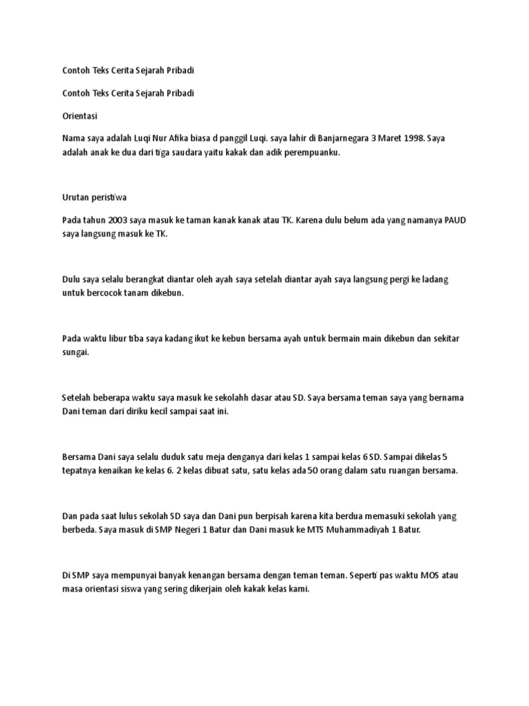 Terserah kehendak penulis teks cerita sejarah. Kami paham kamu ingin memperoleh contoh teks yang singkat silahkan gunakan beberapa contoh berikut ini. Saya anak pertama dari dua bersaudara. Contoh teks eksemplum pengalaman pribadi singkat. Sejarah pribadi selalu menarik minat pembaca terutama contoh teks cerita sejarah pribadi milik selebritis atau tokoh dunia. Perbedaan teks sejarah pribadi dengan biografi adalah biografi ditulis oleh orang lain yang biasanya pada saat yang bersangkutan telah tiada sedangkan teks cerita sejarah pribadi ditulis oleh orang yang mengalami kejadian.