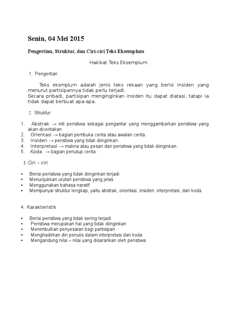 Contoh cerita teks eksemplum. Teks eksemplum ini umumnya diawali dengan adanya pengenalan diri si tokoh seperti apa wataknya bagai mana kehidupan kesehariannya status dan sebagainya keterangan mengenai dirinya. Teks ini termasuk jenis karya yang mengandung pengalaman makhluk hidup. Teks eksemplum adalah teks cerita yang menceritakan tentang perilaku atau tokoh dari sebuah ceritaceritanya diawali dengan pengenalan tokoh setelah itu membahas peristiwa apa saja yang dilalui oleh tokoh dan diakhiri dengan interpretasi dari dalam diri tokoh tersebut. Pada jaman dahulu di sebuah desa di pegunungan wilis ada seorang pemuda yang tinggal berdua bersama ibunya. Ceritanya diawali dengan perkenalan tokoh. Contoh teks eksemplum biasanya diawali dengan pengenalan tokoh kemudian peristiwa yang dialami oleh tokoh serta ditutup dengan interpretasi yang timbul dari tokoh tersebut.