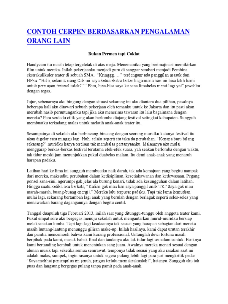 Contoh cerpen pengalaman orang lain. Pengalaman tidak selalu datang dari kejadian yang dialami diri sendiritetapi juga bisa berasal dari kehidupan orang lainpengalaman dari orang lain itu bisa diperoleh secara langsung dara narasumbernyahal itu terjadi saat kita mendengarkan seseorang membagi penglaman. Related posts to contoh cerpen menceritakan pengalaman orang lain contoh cerpen menceritakan pengalaman orang lain 2019 09 28t051200 0700 rating. Daftar isicontoh cerpen singkat pendek1. Contoh cerpen berdasar pengalaman orang lain dunia itu sempit. Tapi ada istilah orang tua kedua yang ada di sekolah. Mulai dari kisah sedih hiburan motivasi dan masih banyak lagi yang lainnya.