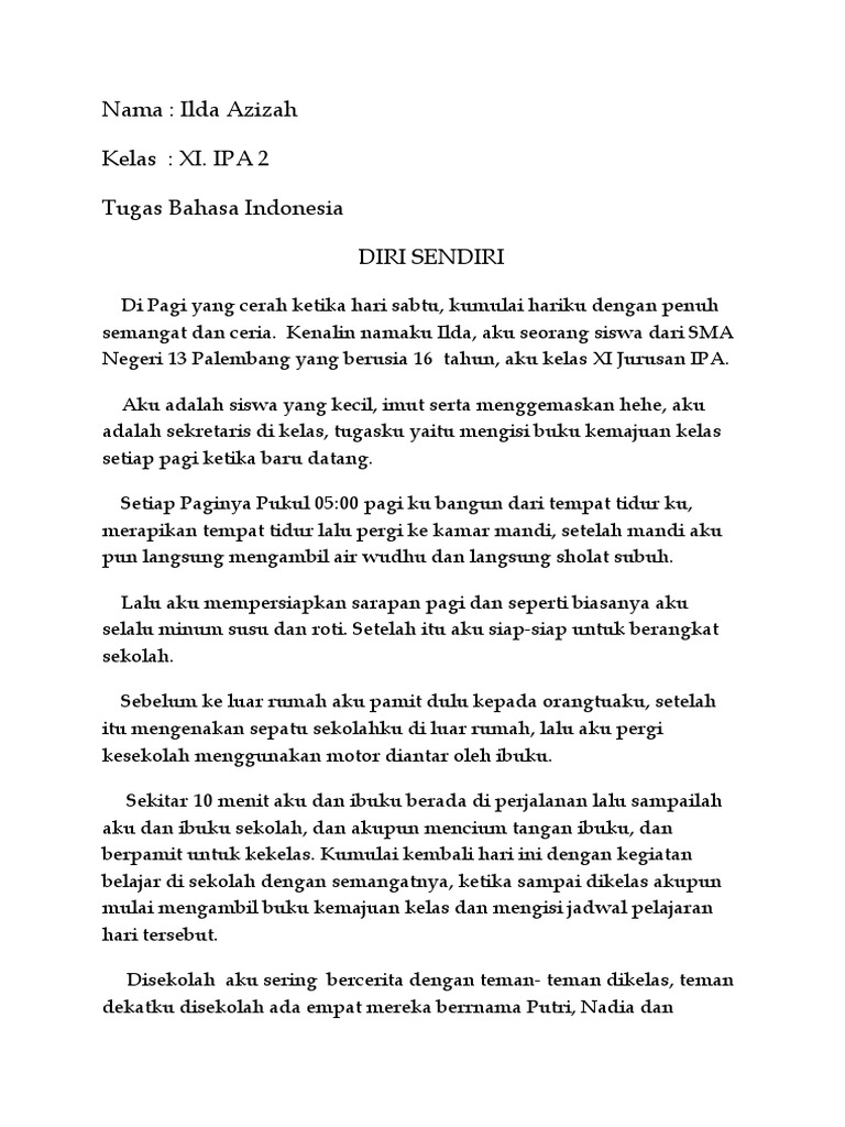 Contoh biografi diri sendiri biografi merupakan tulisan tentang perjalanan hidup atau riwayat hidup seseorang yang dapat ditulis dalam beberapa baris kalimat saja atau sampai menjadi sebuah buku. Setelah kami makan siang dan bercerita tentang banyak hal mengenai kehidupan kami masing masing waktunya belajar bersama. Contoh essay singkat tentang diri sendiri di dalam dunia tulisan menulis suatu karangan tentulah bukal sesuatu hal yang asing lagi bagi kita semuakarangan tersebut meliputi karya non fiksi dan fiksi. Contoh contoh buku yang menceritakan diri sendiri. Teks biografi ditulis oleh orang lain. Dalam penulisannya teks ini menggunakan sudut pandang.