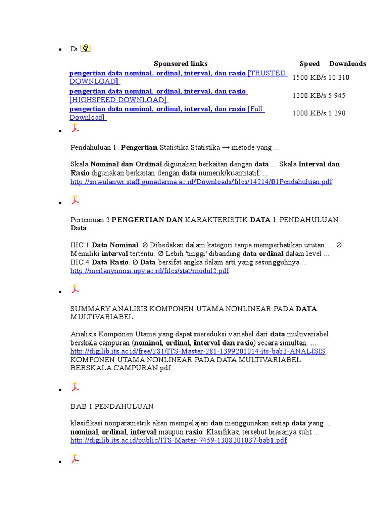 Contoh data nominal ordinal interval dan rasio pdf. Data berskala rasio adalah data yang diperoleh dengan cara pengukuran dimana jarak dua titik pada skala sudah diketahui dan mempunyai titik nol yang absolut. Berikut ini adalah ciri ciri dari skala interval. Atau pergantian tahun pada system kalender masehi setiap 1 januari berbeda dengan pergantian tahun jawa. Ini berbeda dengan skala interval dimana taka da titik nol mutlakabsolut. Contoh skala nominal ordinal interval dan rasio a. Skala nominal skala label skala ini menempatkan angka sebagai atribut objek.