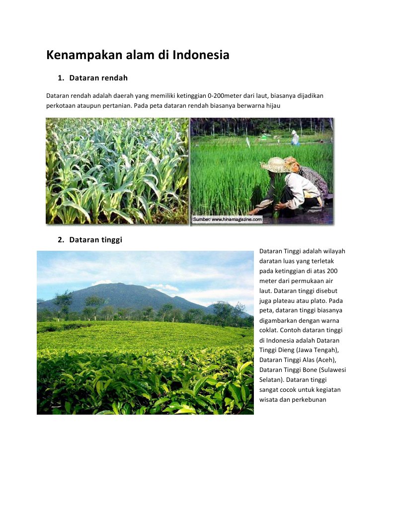 Indonesia adalah negara kepulauan yang memiliki bermacam keadaan alam beberapa contoh dataran rendah di indonesia berikut ini mungkin hanya sebagian kecil pembahasan tentang negeri nusantara yang memiliki banyak panorama alam yang indah. Contoh nama wilayah dataran tinggi dan rendah di indonesia luasnya wilayah indonesia yang memiliki bermacam area menjadikan kita masyarakat yang beragam misalnya contoh dataran rendah di indonesia yang mempunyai banyak potensi alam namun belum dimanfaatkan secara maksimal. Contoh dataran tinggi di indonesia diantaranya dataran tinggi dekkan dataran tinggi gayo dataran tinggi dieng dataran tinggi malang. Dari beberapa tempat yang ada di indonesia dapat dikategorikan sebagai dataran tinggi maupun daratan rendah tergantung kondisi lingkungan dan lokasi dari. Dataran rendah merupakan wilayah yang sering dijadikan tempat tinggal bagi sebagian masyarakat indonesia karena suhu di dataran rendah cukup nyaman karena tidak terlalu dingin seperti di dataran tinggi dan tidak terlalu panas seperti di pesisir. Dataran tinggi terbentuk sebagai hasil erosi dan sedimentasi.