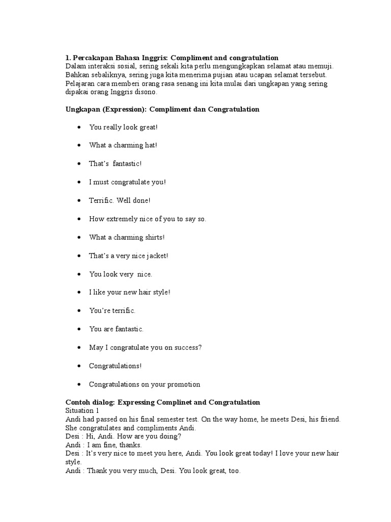 2 contoh dilaog compliment pendek bahasa inggris dan artinya. Kumpulan contoh percakapan bahasa indonesia singkat berikut ini mungkin bisa jadi referensi untuk kalian yang mendapat tugas untuk membuat percakapan bahasa indonesia antara dua orang. Sekian semoga dialog compliment di atas membantu teman. 123 teks percakapan bahasa inggris singkat 2 orang agar bisa bercakap cakap menggunakan bahasa inggris tentu harus perlu pengetahuan akan maksud yang akan diucapkan. Namun sebelum membuat contoh compliment dalam bentuk dialog untuk 2 3. Itu tadi beberapa contoh dialog compliment kali ini.