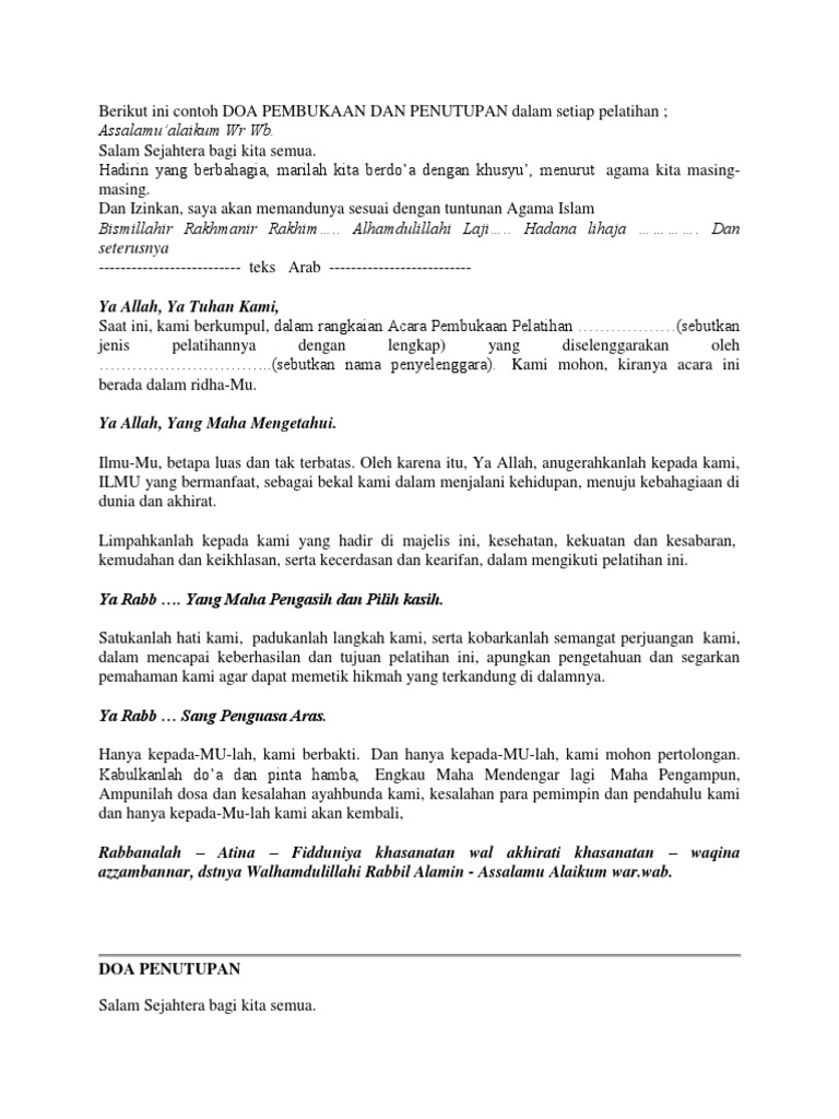 Jadi sebelum orang orang yang menghadiri tersebut beranjak pergi ada baiknya untuk membaca doa penutup acara perpisahan untuk memohon perlindungan kepada allah swt. Assalamu alaikum warahmatullahi wabarakatuh hallo sobat kali ini rumuscoid akan menytampaikan materi tentang doa penutup acara dalam ajaran islam arab dan latin lengkap dengan pengertian keutamaan makna arti adab dalam dalam berdoa supaya mudah dipahami. Contoh penutup pidato penutup pidato adalah bagian akhir sebuah pidato yang biasanya berisikan permintaan maaf penyampaian pesan bahkan ada juga berisikan penekanan terhadap suatu informasi atau pesan yang ingin disampaikan kepada pendengar. Doa di dalam doa penutup acara ini berisi tentang memohon ampunan kepada allah swt atas segala dosa yang telah kita perbuat. Namun penutup pidato dapat dijadikan sebuah kesan yang lucu agar mudah diingat oleh pendengar maupun audien. Berikut ini 4 doa pembuka acara yang sesuai sunnah lengkap dengan artinya.