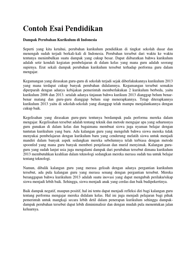 Contoh esai tentang pendidikan. Pendidikan masa kini hai assalamualaikum saya rizky rahmadhani dari fakultas teknik jurusan ikk prodi pkk disini saya akan menjabarkan sedikit tentang pendidikan masa kini saya minta maaf kalau misalnya ada kata kata saya yang kurang berkenan. Contoh teks berita tentang banjir pendidikan kecelakaan kebakaran dll contoh pidato bahasa indonesia dengan berbagai tema 10 contoh cerpen singkat persahabatan pendidikan islami lucu dll 23 contoh brosur dan flyer makanan produk promosi iklan sekolah contoh undangan aqiqah untuk buah hati tercinta anda 15 contoh cv curriculum vitae daftar riwayat hidup terlengkap terbaru. Contoh ini sendiri mengulas tentang peran pendidikan terhadap pebangunan nasional. Untuk mempermudah teman teman dalam membuat essay kali ini karyatulisku akan berbagi kepada teman teman beberapa contoh. Sebelumnya kita telah mengetahui dan memahami jenis jenis esai struktur esai yang baik cara membuat esai yang benar contoh esai singkat dan contoh esai sastraberikut disajikan contoh contoh esai tentang pendidikan. Simak contoh essay jenis reflektif judul.