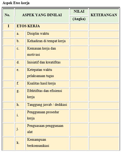 Contoh form penilaian pkl. Contoh form nilai kkp bsi. Contoh format absensidaftar nilai dan agenda harian pkl daftar hadir. Contoh sertifikat pkl diatas tentu dapat anda gunakan sebagai referensi. Form penilaian praktek kerja lapangan pkl. Pkl 7 nama instansiperusahaan 8 unit kerja 9 alamat instansi perusahaan 10 telepon 11 pembimbing pkl di instansiperusahaan no unsur penilaian nilai angka huruf kedisiplinan 1 ketepatan waktudisiplin 2 sikap kerjaprosedur kerja 3 tanggung jawab terhadap tugas 4 kehadiranabsensi prestasi kerja 5 kemampuan kerja 6 keterampilan kerja 7 kualitas hasil kerja kemampuan beradaptasi 8 kemampuan. Kemampuan bekerja dalam tim 5.