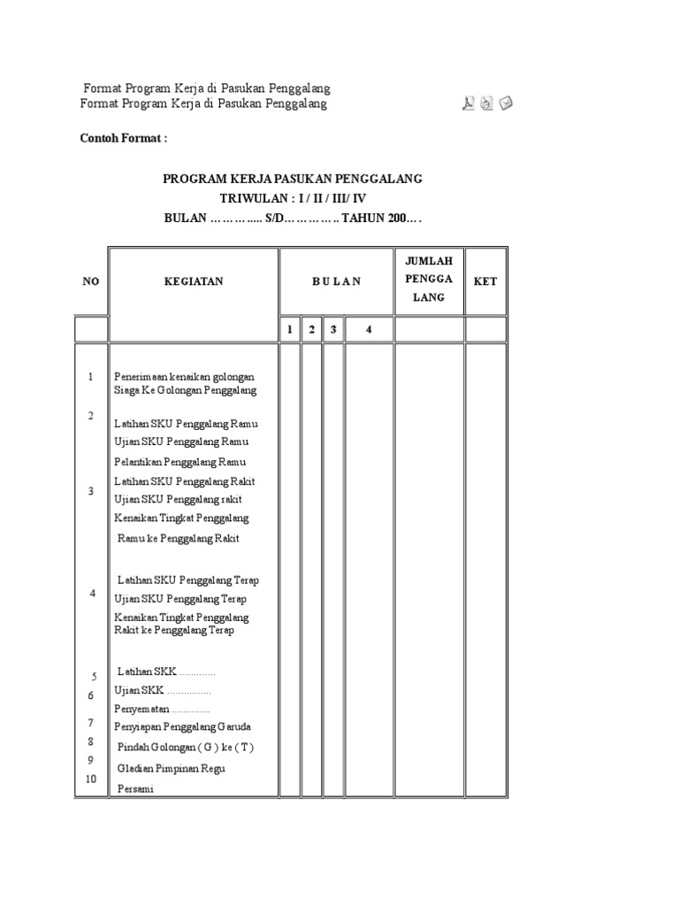 Contoh format program kerja. Bab i konsep 1. Proposal pelaksanaan program kerja ikatan keluarga pelajar dan mahasiswa kabupaten sumbawa barat malang 2015 sekretariat. Program towards 1st class 2. Universiti tun hussein onn malaysia kertas kerja program towards 1st class anjuran jabatan kaunseling dan kerjaya pusat pembangunan dan pengembangan pelajar 18 hingga 20 februari 2011 nama program. Seorang pimpinan harus bias memilih program kerja yang menjadi prioritas utama dalam sebuah organisasi yang menguntungkan untuk organisasi menentukan sebuah kepanitiaan dan menentukan bidang bidang yang dibutuhkan menentukan garis garis besar dan tata cara pelaksanaan program kerja dari tiap tiap bidang mengalokasikan sumberdaya dan mengotrol jalannya. Format program kerja dan administrasi tu tata usaha lengkap ini mungkin bermanfaat juga bagi anda yang membutuhkan referensi untuk perbandingan terkait dengan program kerja tata usaha smp doc program kerja tata usaha sma negeri program kerja tata usaha smk contoh program kerja tata usaha sekolah dasar program kerja tata usaha smk doc program kerja tata usaha smk swasta program kerja.
