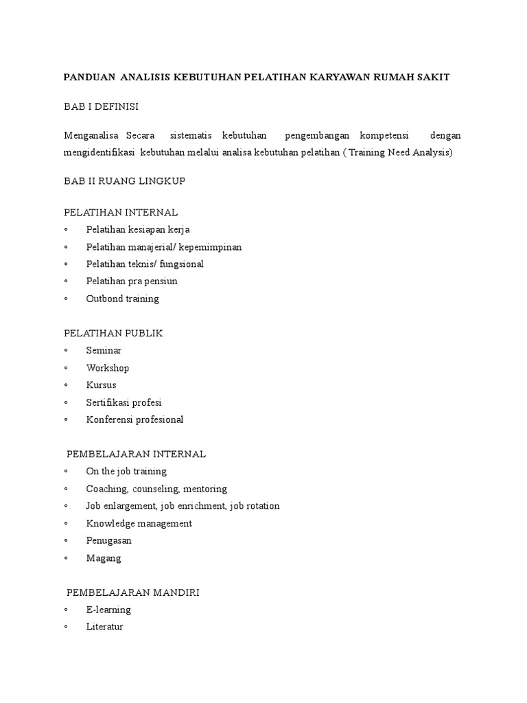 Terlepas dari berbagai pengertian yang dikeluarkan sebagai teori analisa kebutuhan atau training need assement tna sendiri secara umum diartikan sebagai sebuah proses percobaan dalam diagnostic atau identifikasi dari berbagai kebutuhan sebuah organisasi dimana hasilnya berpotensi untuk dipenuhi dalam pelatihan tersebut. Tugas saudara adalah melakukan nalisis penyebab masalah dan identifikasi solusi. Hal ini dilakukan untuk mengetahui sejauhmana potensi. Kondisi sekarang banyak masyarakat yang masih tinggal di serter serter. Analisa kebutuhan training training need analysis analisa kebutuhan training dapat dilakukan dengan dua pendekatan yakni. Dari analisis yang paling sederhana pada pelatihan hal ini perlu melalui analisis yang luas dan kompleks dengan melihat peran kerja tugas tugas khusus karyawan dan pemetaan karyawan ke profil kompetensi perusahaan.