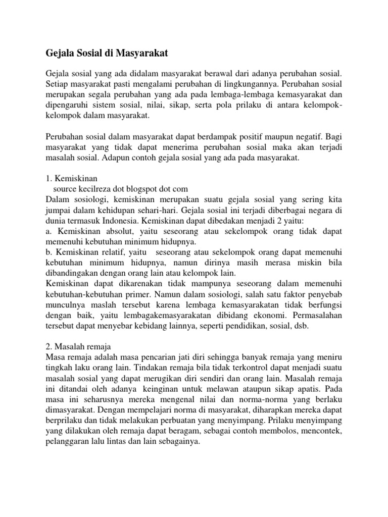 Akibat kondisi inilah banyak wni yang hobi memakai baju korea menonton film korea dan lain sebaginya. Tetapi kita bisa untuk mengantisipasinya atau mencegahnya. Gejala sosial adalah sebuah fenomena sosial yang ada di masyarakat perubahan sosial tersebut tidak dapat di hindari oleh kita semua. Adanya gejala sosial di masyarakat ini dipengaruhi oleh beberapa faktor antara lain yaitu. Salah satu contoh gejala sosial yang paling sering ditemui dalam masyarakat yaitu kemiskinan. Gejala sosial dalam masyarakat berawal dari adanya perubahan sosial dalam masyarakat yang dapat dampak positif ataupun negatif.