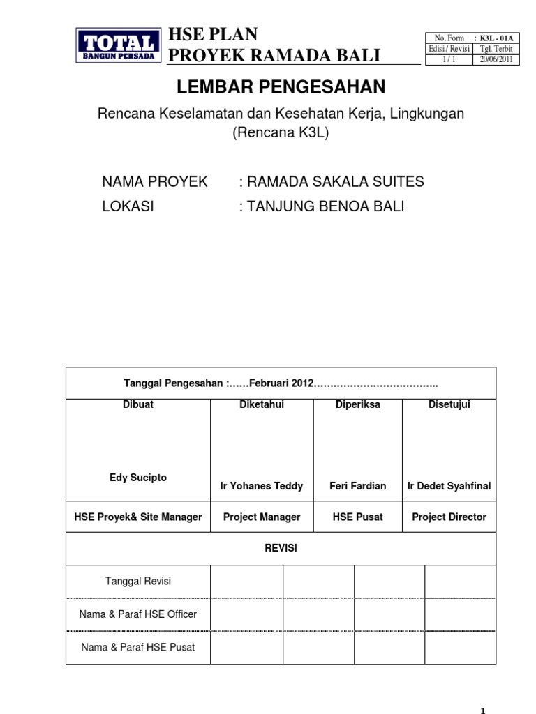 Sebagai contoh adalah hse plan untuk pekerjaan kontruksi di pt pertamina ep bisa anda lihat dan dowload sebagai reperensi anda pada link dibawah ini. Ida project management shall set up a safety committee to enhance execute and follow up occupational safety and environmental matters. Menurut international association of oil and gas producers iogp health and safety environment plan adalah sebuah dokumen terkait keselamatan dan kesehatan kerja yang menentukan apa yang harus dipenuhi pada tahap life cycle kontrak dan langkah yang dibutuhkan oleh siapa dan kapan. Contoh hse plan sering ditanyakan oleh praktisi keselamatan dan kesehatan kerja yang terjun dalam sebuah proyek. Download file hse plan secara lengkap. Academiaedu is a platform for academics to share research papers.