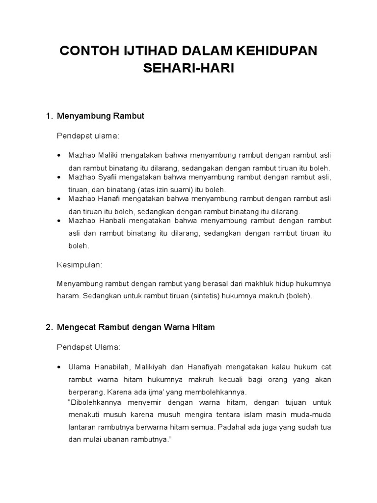 Contoh istishab dalam kehidupan sehari hari contoh istishab dalam ekonomi islam contoh istihsan dalam jual beli contoh istidlal contoh mashalihul mursalah. Mazhab maliki mengatakan bahwa menyambung rambut dengan rambut asli dan rambut binatang itu dilarang sedangakan dengan rambut tiruan. Pengertian ijtihad kata ijtihad berakar dari kata al juhd yang berarti al thaqah daya kemampuan kekuatan atau dari kata al jahd yang berarti al masyaqqah kesulitan kesukaran. Oleh dosen pendidikan 2 diposting pada 28032020. Ijtihad 1 ilmu 1 imam ghazali 4 iman 1 iman kepada qada qadar 1 islam 1 islam sunni 1 islam syiah 1 kado 1 kata muhasabah 1. Salah satu contoh ijtihad adalah suatu peristiwa yang pernah terjadi di zaman khalifah umar ibn khattab.