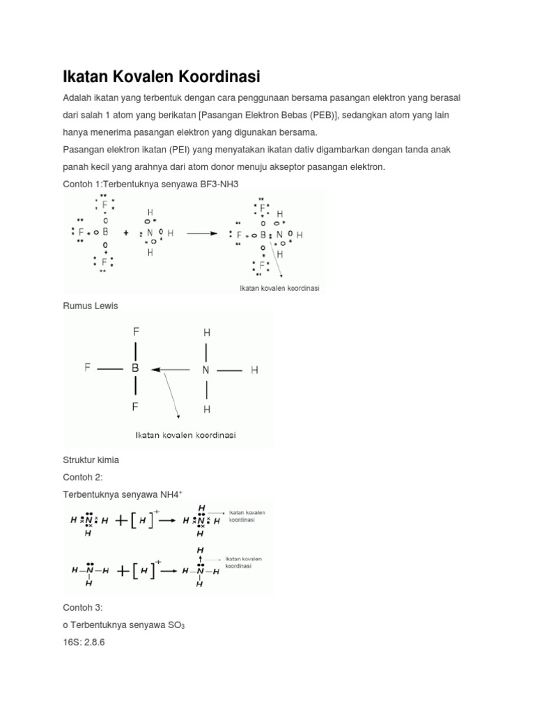 Contoh ikatan kovalen koordinasi. Contoh ikatan kovalen koordinasi. Ikatan kovalen koordinasi ikatan kovalen koordinasi adalah ikatan yang terbentuk apabila pasangan elektron yang digunakan bersama berasal dari salah satu dari dua atom yang berikatan. Contoh ikatan kovalen koordinasi proses pembentukan pengertian soal kunci jawaban senyawa unsur kimia ikatan kovalen koordinasi adalah ikatan yang terbentuk dari pemakaian pasangan elektron bersama yang berasal dari salah satu atom yang memiliki pasangan elektron bebas. Kategori ipa kimia tag 10 contoh ikatan kovalen bentuk molekul dari senyawa nh3 adalah ciri ciri ikatan kovalen. 7n 1s2 2s2 2p3. 5b 1s2 2s2 2p1.