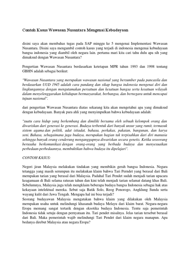 Contoh implementasi wawasan nusantara. Implementasi wawasan nusantara dalam cakupan pembangunan nasional meliputi beberapa hal yaitu. Implementasi wawasan nusantara dalam kehidupan sosial budaya akan menciptakan sikap batiniah dan lahiriah yang mengakui segala bentuk perbedaan sebagai kenyataan hidup sekaligus karunia tuhan. Menjadikan falsafah pancasila ialah sebagai pedoman hidup bernegara serta bermasyarakat. Contoh kasus wawasan nusantara mengenai kebudayaan disini saya akan membahas tugas pada sap minggu ke 5 mengenai implementasi wawasan nusantara. Wawasan nusantara harus diimplementasikan ke dalam semua aspek kehidupan mulai dari bidang ekonomi sosial hingga politik. Perwujudan kepulauan nusantara sebagai satu kesatuan politik bersama dengan bangsa bangsa dunia lainnya indonesia turut serta dalam mewujudkan cita cita ketertiban dan perdamaian dunia melalui politik luar negeri bebas aktif.