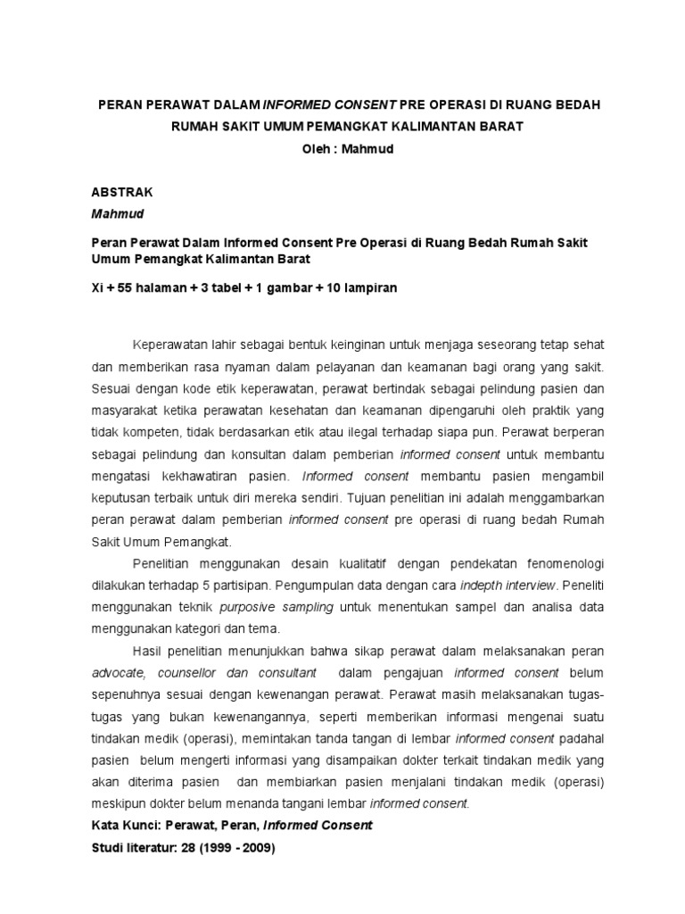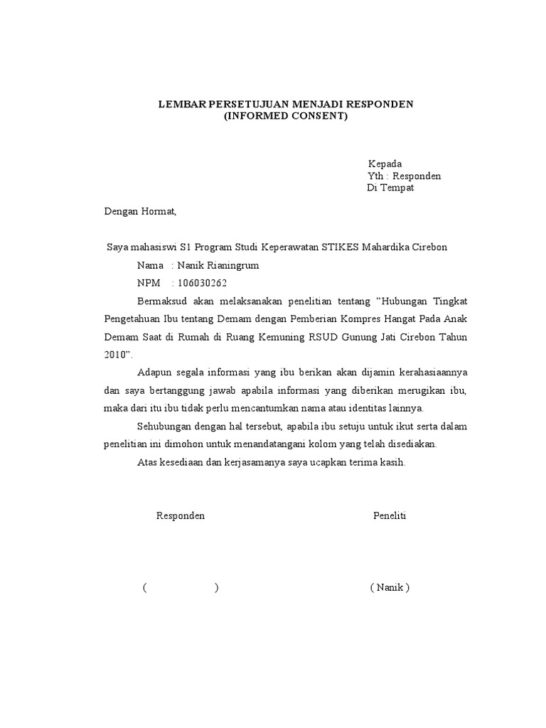 Contoh informed consent penelitian skripsi. Contoh informed consent dari rs muhammadiyah selogiri 5. Blog ini memuat contoh karya ilmiah yang bermanfaat untuk membantu mempermudah anda dalam penyusunan skripsi semoga bermanfaat monday 2 november 2015. Saat ini saya sedang mengerjakan tugas akhir skripsi untuk menggali strategi koping pada pasien diabetes mellitus dm tipe 2 di poliklinik penyakit dalam rumah sakit dkt dinas kesehatan tentara bandar lampung. Contoh informed consent dari rs ortopedi surakarta 6. Persetujuan informed consent menjadi responden. Contoh informed consent penelitian kualitatif.