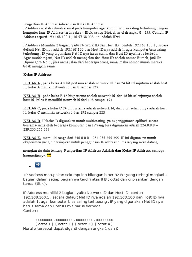 Network id dan host id didalam ip address dibedakan oleh penggunaan subnet mask. Ip address dibagi ke dalam lima kelas yaitu kelas a kelas b kelas c. Contoh ip address kelas a. Masing masing subnet mask menggunakan pola nomor 32 bit yang merupakan bit groups dari semua satu 1 yang menunjukkan network id dan semua nol 0 menunjukkan host id dari porsi ip address. Ipv 4 memiliki panjang 32 bit dan mampu untuk mengalamatkan kurang lebih 4 miliar host. Oleh dosen pendidikan 3 diposting pada 26032020 29032020.