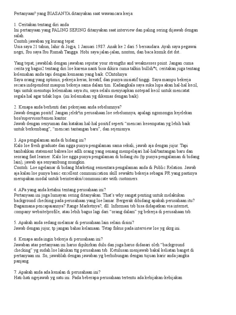 Itulah beberapa jawaban interview kenapa anda ingin bekerja disini. Usahakan jawablah pertanyaan saat wawancara dengan santai rileks tapi tetap fokus. Anda perlu jawaban yang lebih berkelas sehingga ini bisa menjadi salah satu poin yang dapat anda tonjolkan selagi melakukan interview kerja. Fokuskan perhatian anda pada hal hal yang terkait erat dengan pengetahuan keterampilan dan pengalaman yang anda miliki. Dengan pengetahuan terkait perusahaan dan antusiasme anda anda akan dinilai oleh pewawancara update terkait perkembangan perusahaan mereka. Berikut ini beberapa hal yang bisa kamu lakukan agar kamu lebih yakin dalam membuat jawaban.