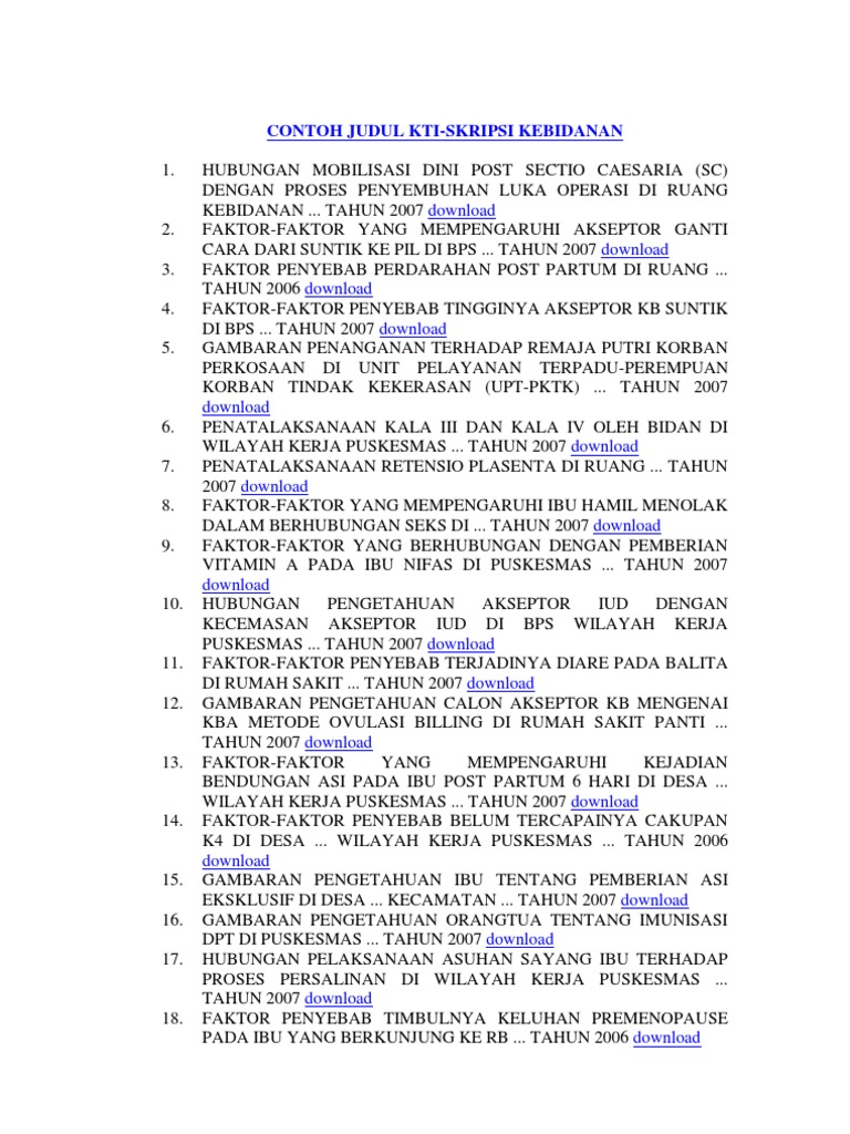 Karya tulis ilmiah kti kebidanan contoh kti kti keperawatan judul kti kb kumpulan kti kebidanan kti kuliah bidan contoh kti kebidanan judul kti kebidanan karya tulis ilmiah kebidanan contoh skripsi kebidanan contoh karya tulis ilmiah kebidanan kti bidan kti inisiasi menyusui dini judul skripsi kebidanan kti kebidanan pdf kti kebidanan terbaru kti kebidanan d3 2010 2011 2012. Contoh skripsi kebidanan tema skripsi kebidanan sangat beragam. Pada blog ini saya menyediakan judul judul kti untuk kebidanan silahkan tentukan pilihan anda. Analisa senam hamil pada ibu hamil di kelas ibu di posyandu. Hubungan pengetahuan dan dukungan keluarga terhadap keaktifan lansia ke posyandu lansia. Kami siapkan hanya contoh sebagai bahan referensi dalam pembuatan kti kebidanan jika berminat download softcopynya silahkan hubungi kami di.