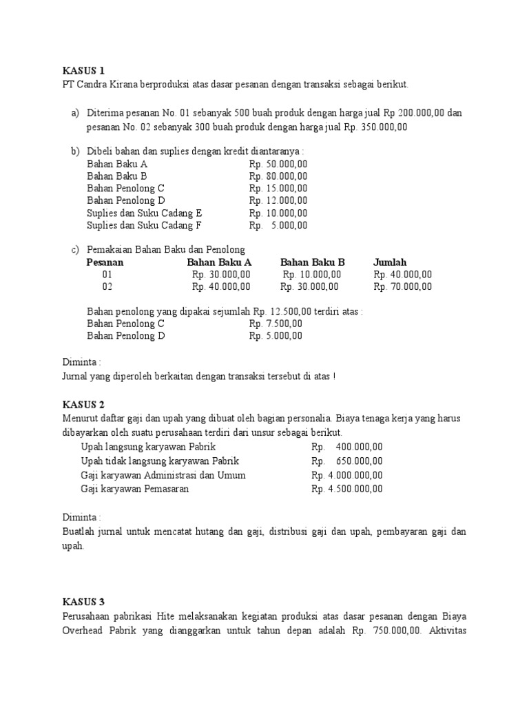 Pt gayanaji adalah perusahaan manufaktur yang memproduksi furniture dari kayu. Pada periode ini pt jaya memproduksi sebuah produk berdasarkan pesanan dengan nomor 001ii yang harus selesai pada 31 september 2011. Mata kuliah akuntansi biaya ekma4315 ini membahas proses pencatatan penggolongan peringkasan dan penyajian informasi biaya untuk menentukan harga pokok produksi baik dengan metode harga pokok pesanan maupun harga pokok proses dengan sistem biaya penuh full costing sistem biaya standar maupun sistem biaya variabel variable costing. Ya akuntansi biaya masih masuk ke dalam bidang akuntansi atau ekonomi dan diperuntukkan sebagai proses pencatatan dokumentasi serta analisis biaya kegiatan organisasi perusahaan barang maupun jasa. Sistem persediaan periodik jawaban d adalah sistem dan bukan merupakan metode biaya. Jika pesediaan pada akhir tahun ternyata kurang catat sebesar rp 7500000 kesalahan tersebut akan menyebabkan.