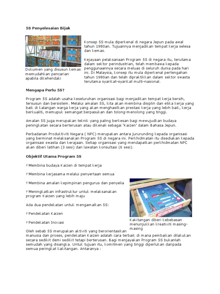 Istilah 5s berasala dari bahasa jepang yang dikenal sebagai singkatan dari. Misal di ruangan advertising dept. Mengatur semua item dengan rapih bersih mudah terlihat secara visual untuk kemudahan penggunaan dan pengambilan jika diperlukan serta memungkinkan. Bisa dikurangi 1 lampu untuk tiap 3 paketderet lampu. Organizing 5s in the office how to make it faster better easier cost effective. Pelaksanaan kaizen event di perusahaan non manufaktur.