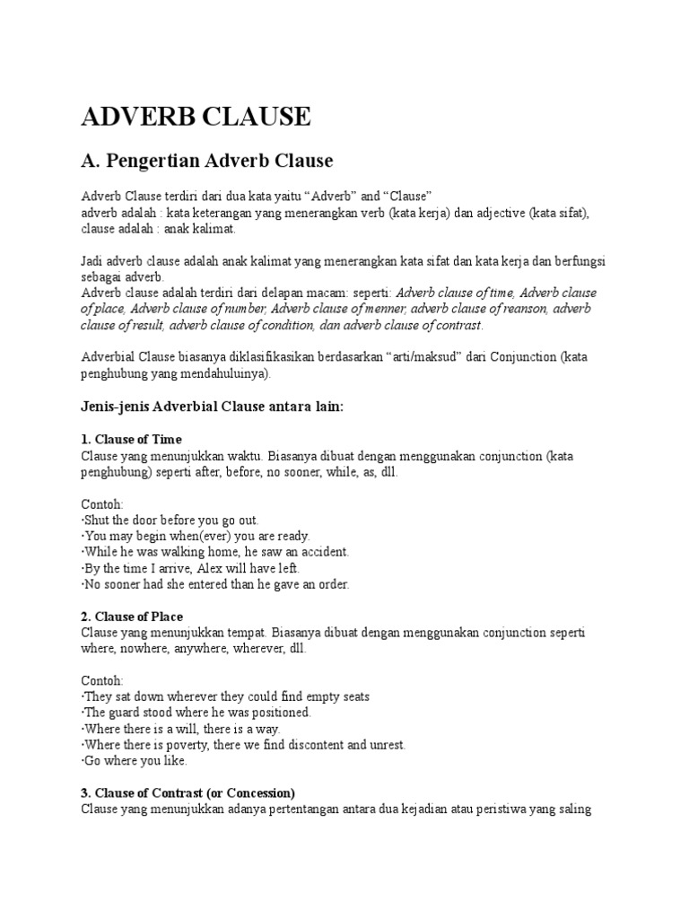 Dalam grammar bahasa inggris ada begitu banyak jenis klausa seperti noun clause adjective clause dan tentu saja kita tidak dapat melewatkan adverb clausenamun permasalahannya masih banyak orang yang kurang paham mengenai apa itu adverb clause dan penggunaannya. Jika ada lebih dari satu kata adverb di dalam suatu kalimat kita perlu mengikuti aturan adverb order. Indikator penggunaan adverb clause dalam kalimat. Adverb clause merupakan jenis klausa yang berperan sebagai adverb dalam satu kalimat. Before after sooner later as while dan sebagainya. Manner place frequency time purpose.