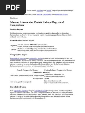Kini saatnya menambah pengetahuan tentang perubahan adjective secara beraturan regular form. Contoh kalimat comparative degree cara membandingkan dua orang binatang benda atau hal. Penjelasan mengenai degree of comparison ini bisa kalian baca pada artikel english cafe bali terdahulu yang berjudul susah membandingkan. Kedua kalimat diatas menyatakan arti yang sama. 5 jenis comparative degree contoh kalimat lengkap materi seputar grammar superlative degree dalam bahasa inggris dengan metode paling lengkap dan mudah. Contoh kalimat degrees of comparison macam aturan dan contoh kalimat degrees of comparison positive degree.