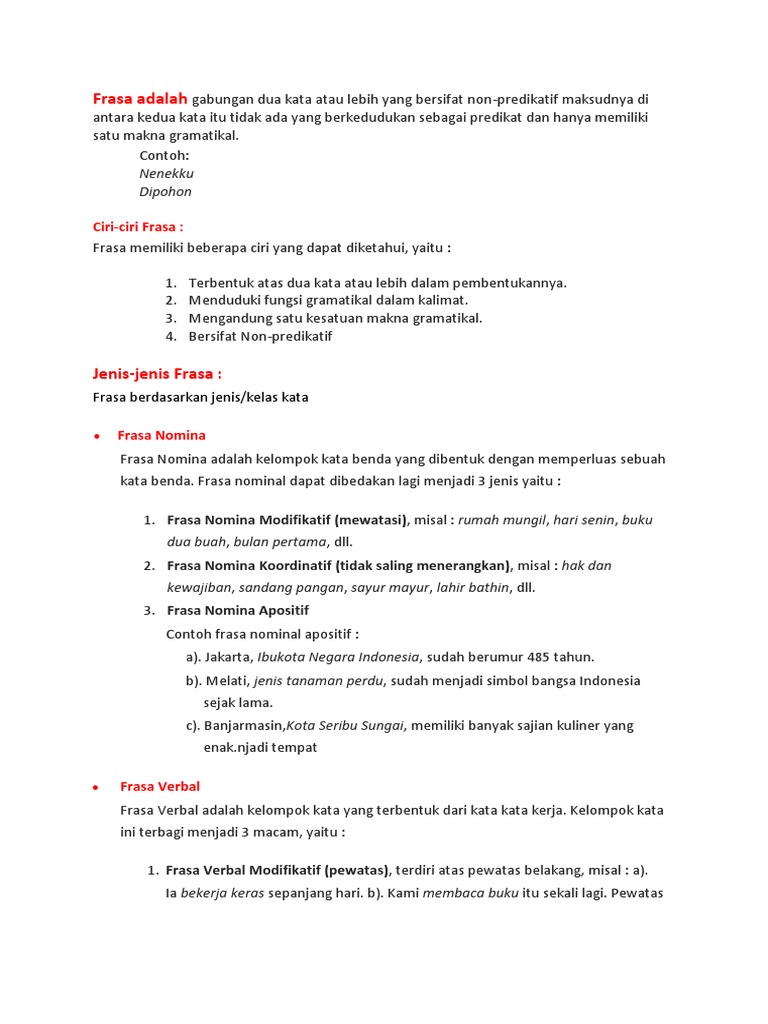 Frasa yang distribusinya sama dengan kata benda. Unsur pusat frasa benda yaitu kata benda. Menduduki fungsi gramatikal dalam kalimat 3. B meja hijau itu milik ibu. Contoh frasa nomina apositif. Frasa adalah sebuah satuan yang terdiri berdasarkan dua kata atau lebih yang menduduki satu fungsi kalimat.