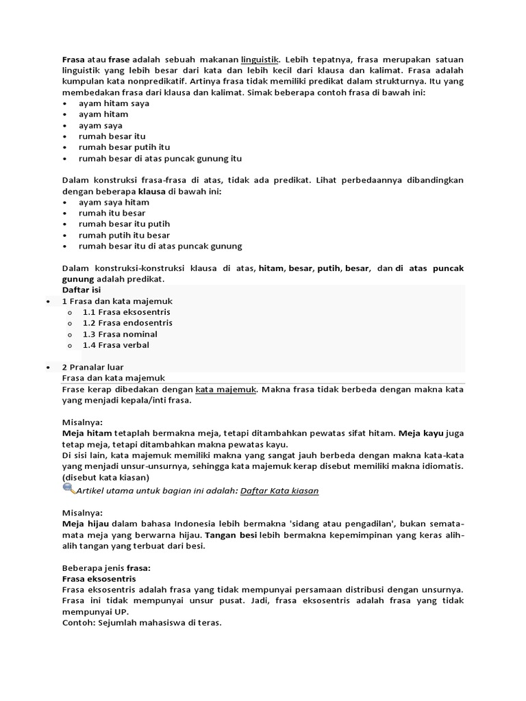Kalimat nominal adalah kalimat yang predikatnya berupa kata benda atau nomina termasuk pronomina dan frasa nominal. Orang tua lintang baru kembali dari jakarta. Menghitung penghasilan minggu ini. Contoh frasa nominal verbal dan endosentris lengkap pada susunan kalimat bahasa dan sastra indonesia terdapat adanya gabungan kata yang memiliki makna. Kami putra putri indonesia siap mengharumkan. Frasa verba tidak bisa diberikan dengan imbuhan kata sangat dan biasanya menduduki fungsi sebagai predikat pada sebuah kalimat.