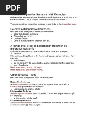 Dalam bahasa inggris imperative sentence is a sentence which give the direction command or advice. Verb yang digunakan pada imperative sentence adalah bare infinitive bentuk dasar dari verb tanpa tambahan s atau eskata please dapat ditambahkan di awal atau di akhir imperative sentence untuk membuat kalimat menjadi lebih sopanimperative sentence diakhiri dengan full stop titik atau bisa juga dengan exlamation mark tanda seru jika melibatkan strong emotion emosi yang kuat. Pengertian jenis dan contoh dalam kalimat bahasa inggris lengkap.